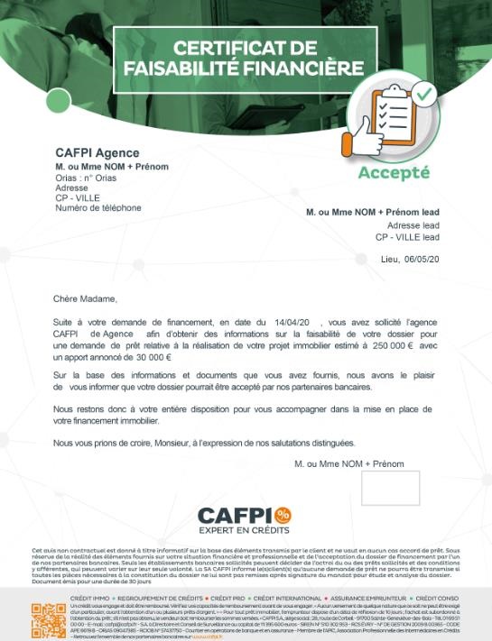 L’obtention d’un « avis » de faisabilité instantané puis d’un « certificat » de faisabilité financière