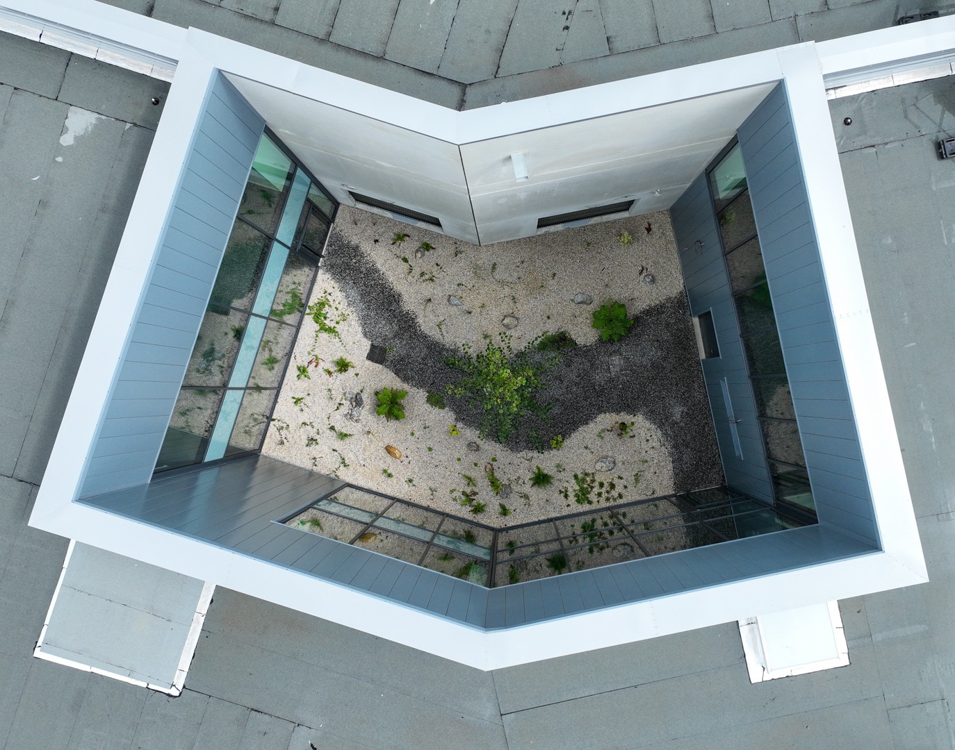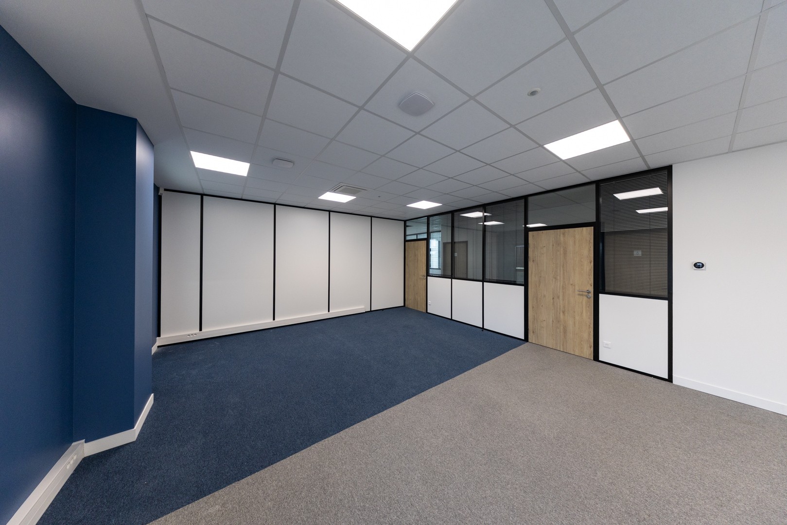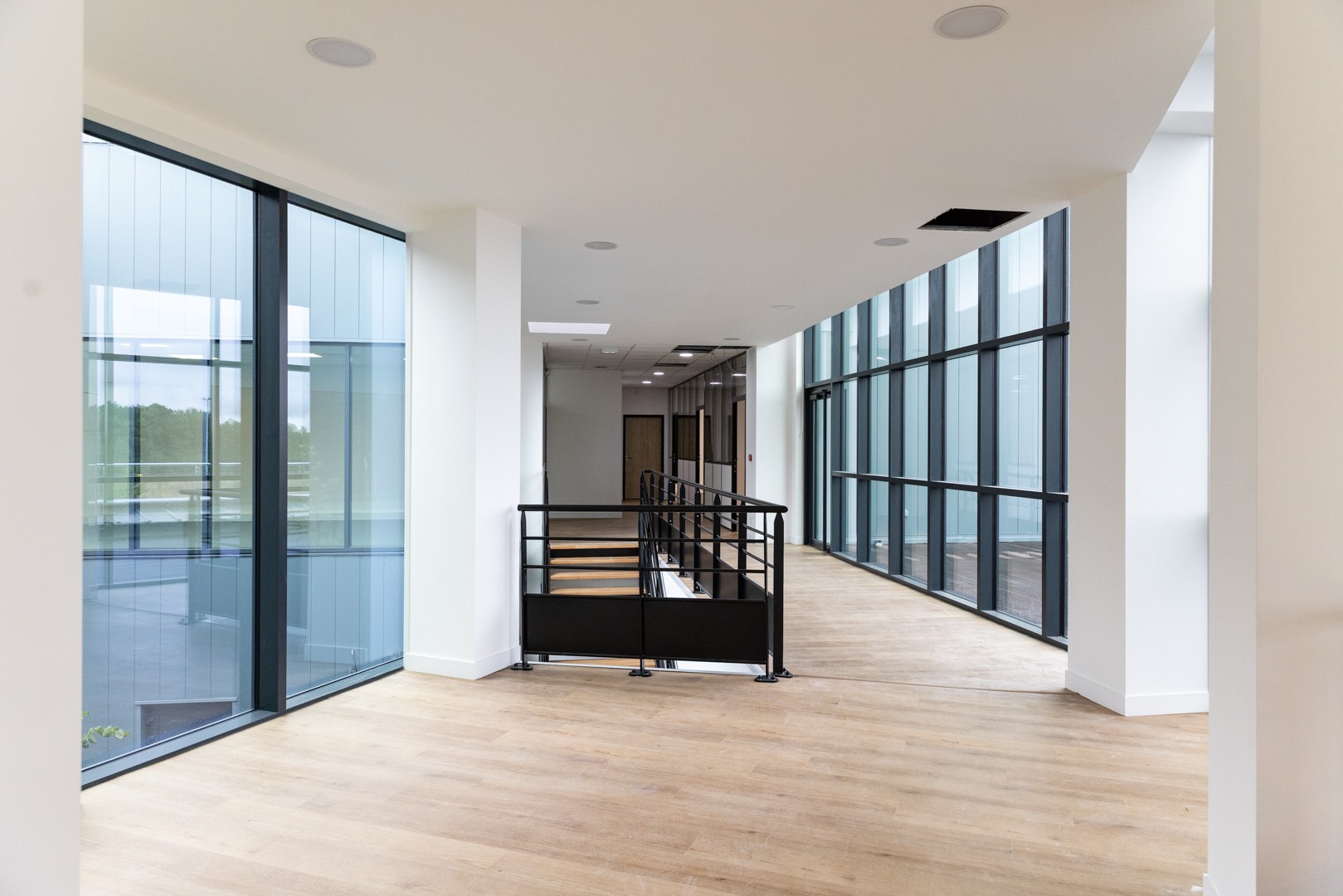 Les bureaux, d’une surface d’environ 1 100 m² répartis sur deux niveaux (R+1), bénéficient d’un traitement architectural soigné. L’espace intègre un hall d’accueil remarquable par sa hauteur sous plafond de six mètres, un patio intérieur favorisant la lumière naturelle, ainsi que deux terrasses, l’une en bois au premier étage et l’autre de plain-pied, attenante au terrain de pétanque aménagé pour le bien-être des collaborateurs.