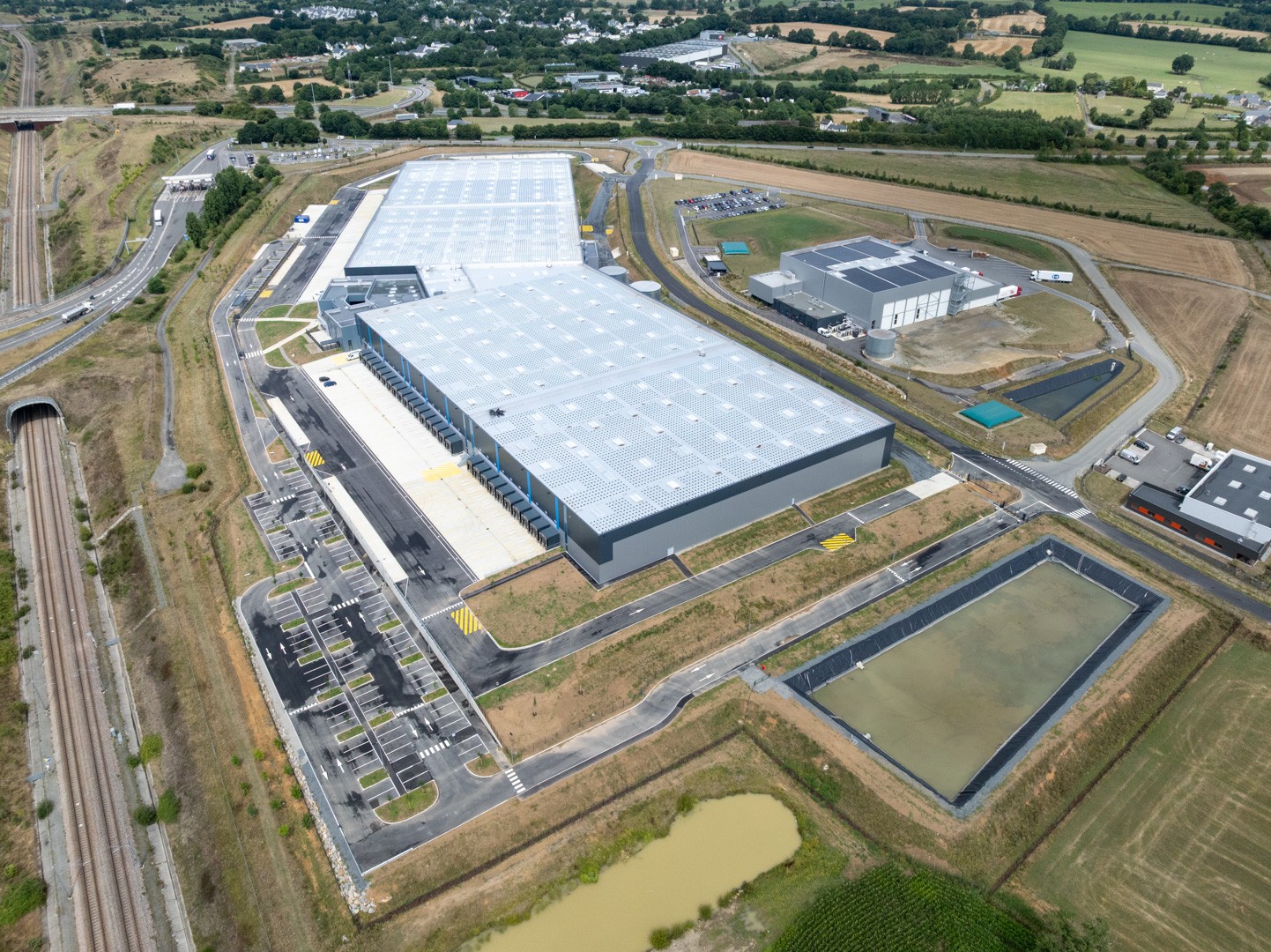 Au-delà de ses dimensions exceptionnelles, la plateforme de Louverné se distingue par son exemplarité environnementale. Le bâtiment a obtenu la certification BREEAM Very Good et intègre plusieurs solutions innovantes en matière de performance énergétique et de réduction de l’empreinte carbone. La toiture est équipée de panneaux photovoltaïques, les eaux pluviales sont récupérées et réutilisées, et des bornes de recharge pour véhicules légers comme pour poids lourds complètent le dispositif, aux côtés d’une station de biocarburant. Les bureaux répondent par ailleurs aux exigences de la réglementation RE 2020.