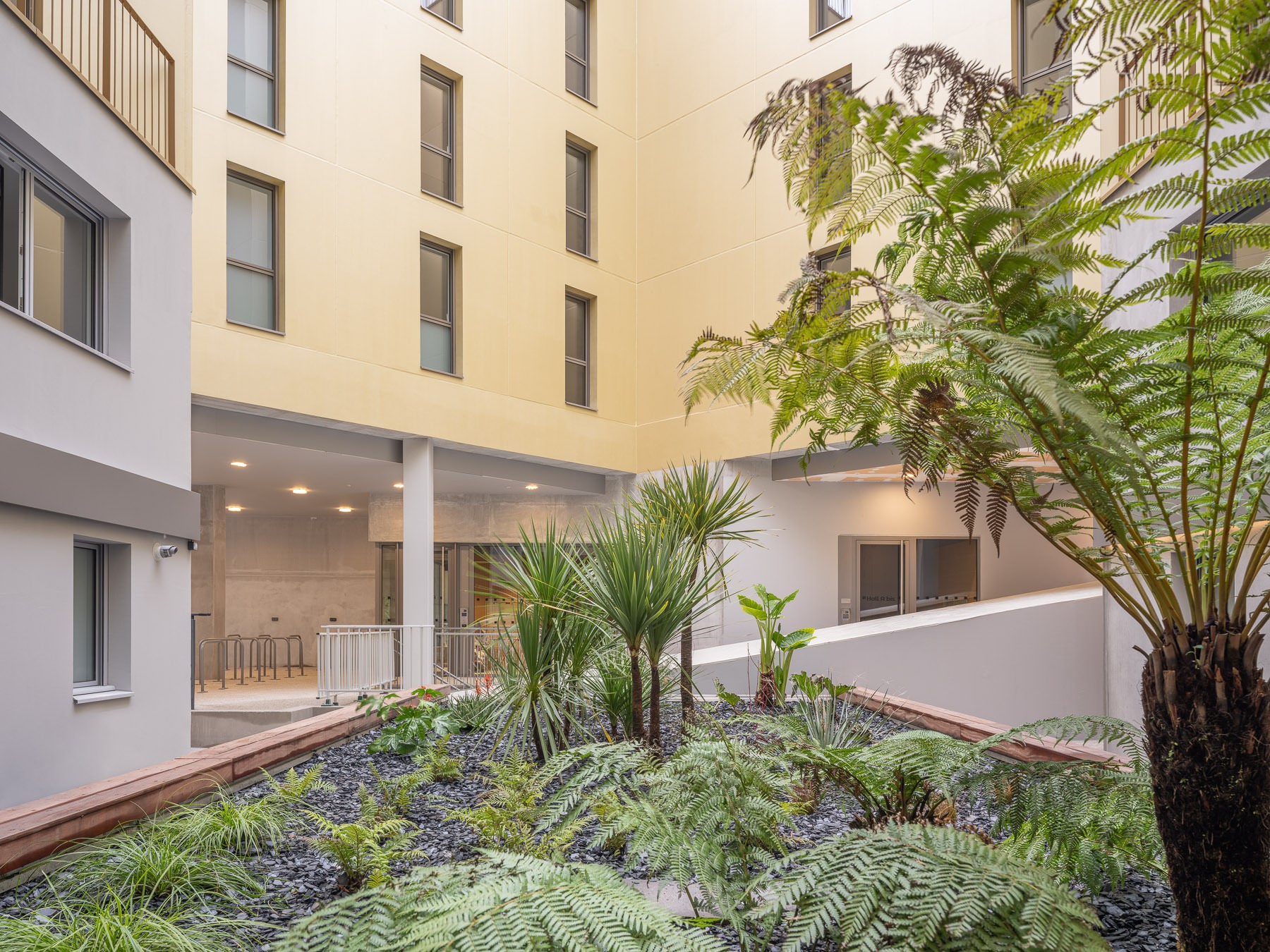 Le porche traversant ouvre sur un jardin intérieur planté d’essences évoquant la Compagnie des Indes, clin d’œil à l’histoire maritime lorientaise. Véritable oasis de verdure, ce patio contribue au confort des résidents et à la biodiversité au cœur du projet.