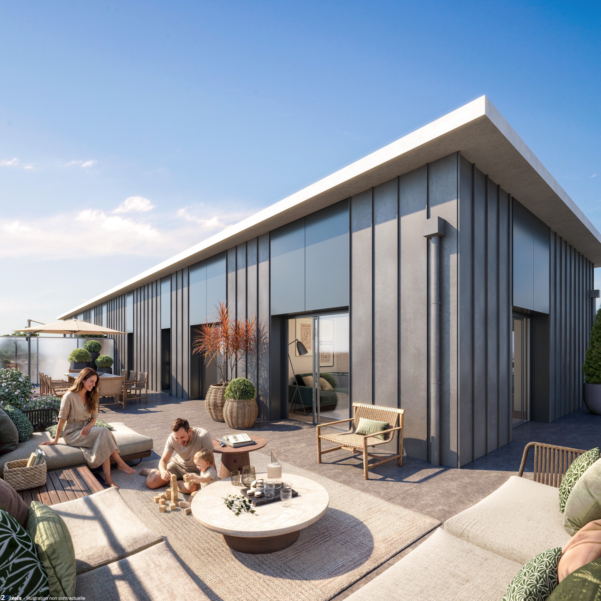 L’architecture privilégie des lignes sobres et pérennes, portées par des matériaux nobles tels que la brique, le zinc et le bois. Les façades, rythmées par des loggias et des terrasses, composent un ensemble élégant, conçu pour traverser le temps et dialoguer avec l’environnement patrimonial du quartier.