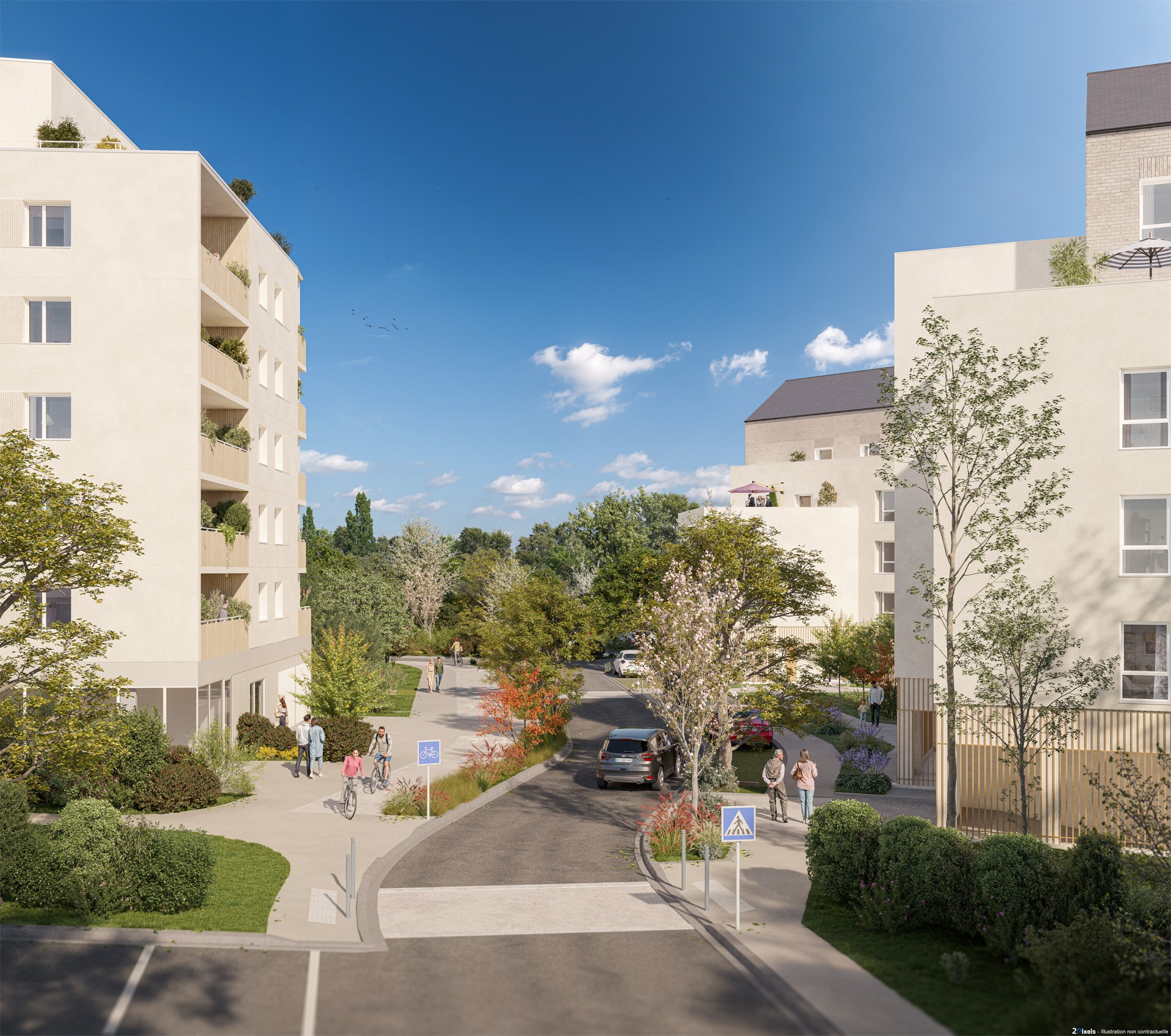 La résidence s’organise autour de trois bâtiments de 4 à 6 étages, disposés autour d’un cœur d’îlot paysager. Véritable espace de respiration, celui-ci structure un cheminement piéton doux et crée une percée visuelle ouverte sur la ville, favorisant les mobilités actives et les usages de proximité.