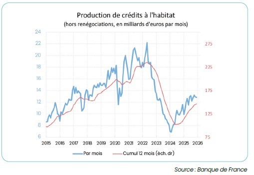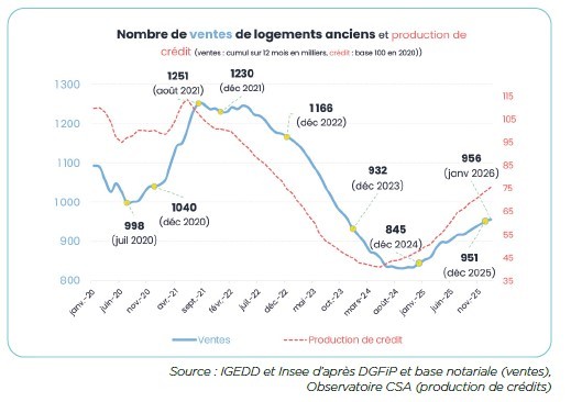 La reprise du marché de l’existant se confirme, à un rythme modéré. Après trois ans de forte contraction, le volume des transactions est reparti à la hausse : 951 000 ventes ont été enregistrées en 2025, soit une progression de 12 % sur un an, avant d’atteindre 956 000 ventes en janvier. Les prix, après un repli moyen de 5 % au niveau national – et plus prononcé dans certaines grandes villes – sont quasi-stables.