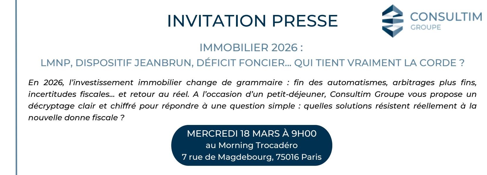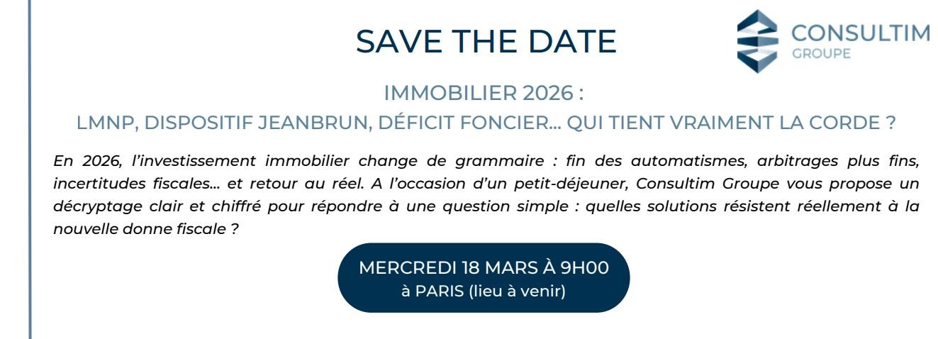 En 2026, l’investissement immobilier change de grammaire : fin des automatismes, arbitrages plus fins, incertitudes fiscales… et retour au réel. A l’occasion d’un petit-déjeuner, Consultim Groupe vous propose un décryptage clair et chiffré pour répondre à une question simple : quelles solutions résistent réellement à la nouvelle donne fiscale ?